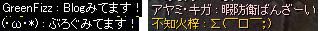 ■おまけコーナー Gvと蜃気楼の塔で、御覧の方々からメッセージを頂きました。 お名前載せていいのかどうか悩みましたが、名前載せないと何が何だかわからないので公表することにしました。「匿名じゃなきゃやだもん♪」という方は、コメントして頂けば隠します。 なるべくその場でお礼を言おうと思ってるんですが、任務優先しないとギルマスにEDP裏切り者で脳天串刺しにされてしまいますので、お返事できないことが多いです。申し訳ありません。 今日は蜃気楼効果のせいか、火炎陣はおろか空蝉まで不発気味だったのが泣けました。皆さんも色々泣かれたことかと思われます。来週は軽いといいですね……。